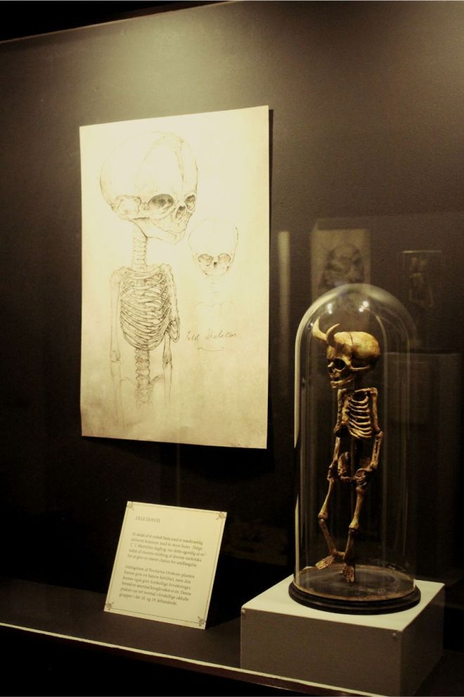 Here you can see a specimen of a human infant skeleton, with a peculiar disformity on the skull, forming two large cranial horns. According to Merrylin’s diaries, this is the result of the mother’s abuse of narcotics.