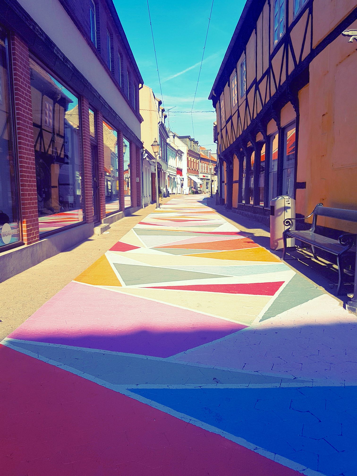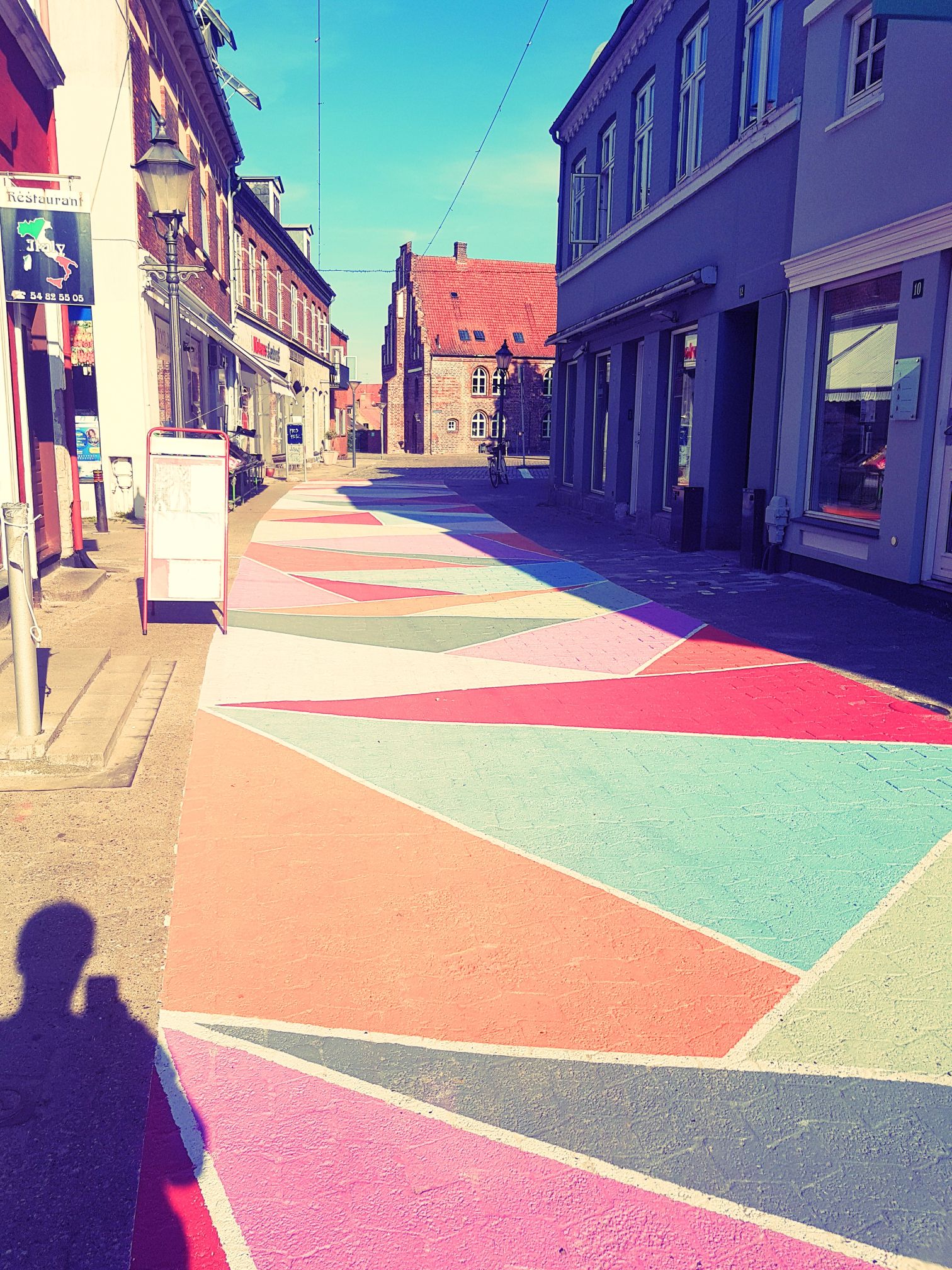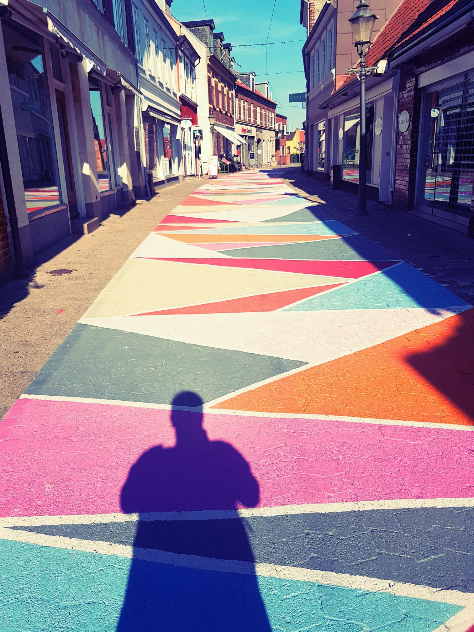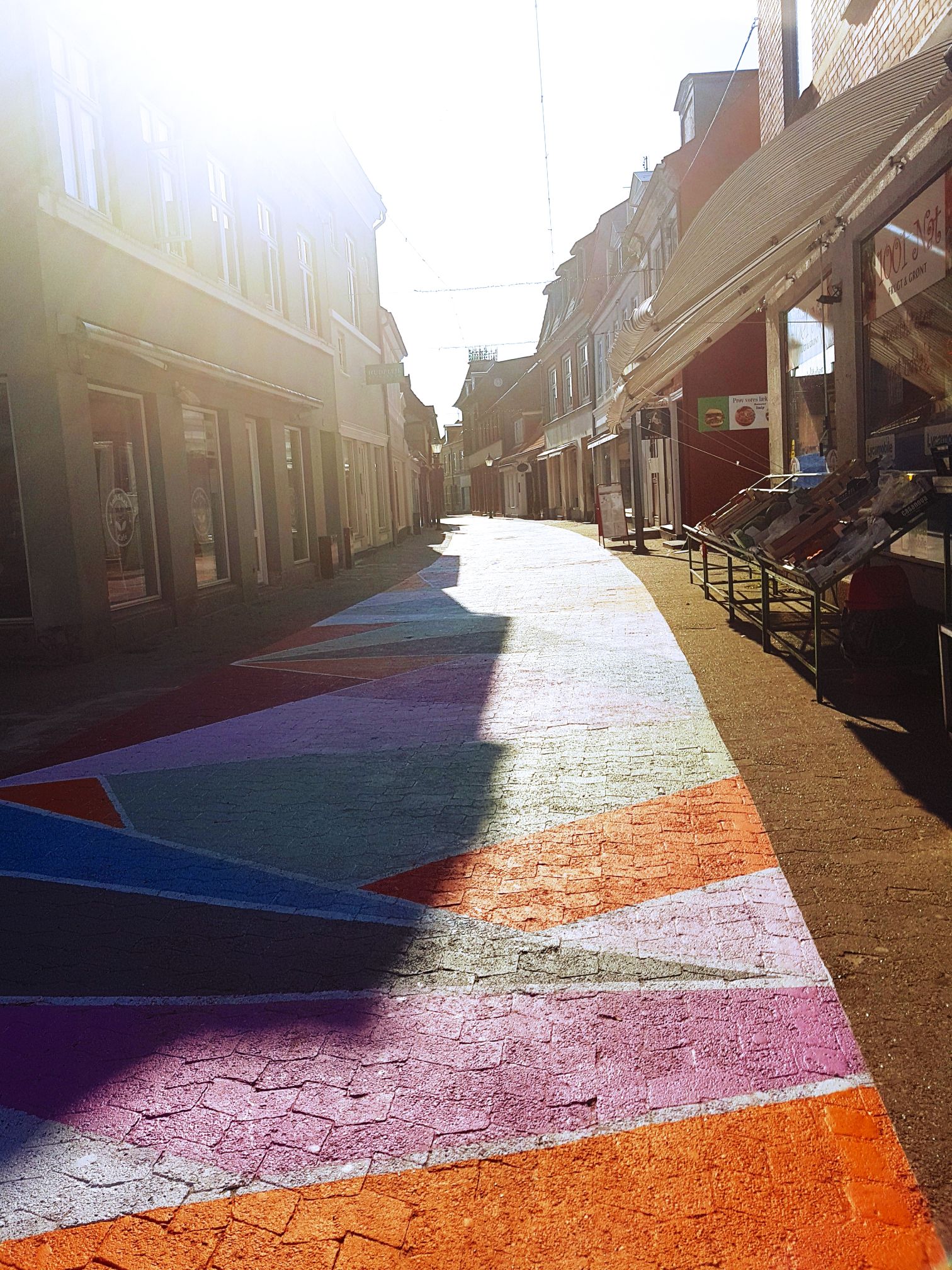 Nykøbing Falster just got a new Instagrammable place ! You’ll find this very colourful street art at Store Kirkestræde, right close to the Abbey Church. The project, called Latinerkvarterets Street Art Projekt (“The Latin Quarter Street Art Project”) was made in collaboration with the commune, the cultural center Multicenter Syd, and several painting shops (Nykøbing F Malerlaug, Colour Plus). ColourPlus actually gave the 100 L of primer, the paint and the materials needed by the young people from the cultural center to make the cozy street colourful.